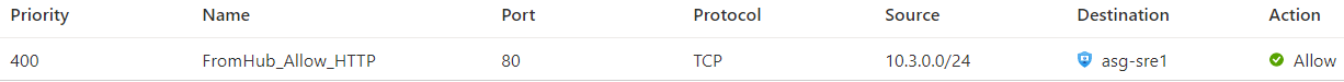 Now, let’s add allow rules in the NSG of a subnet in the spoke. I am going to use HTTP as an example. This means the subnet will need to allow traffic from the IP range of the hub inbound on port 80 and outbound from port 80. To facilitate identifying the webserver VM in the spoke, I created an Application Security Group (ASG). Even with only a single VM, this is beneficial because I don’t have to worry about the IP of the VM changing or future scale out with additional webserver VMs.