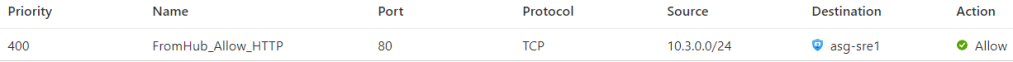 Here’s a screenshot of the inbound and outbound rule created to allow TCP 80 (HTTP) traffic from the hub to the spoke and the response back to the hub.