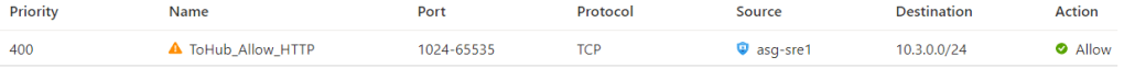 Notice the port range in the outbound rule: it is 1024-65535. This is because the port range in the screenshot is the destination port range. (The source port for the outbound rule is 80.) You can’t determine which port a client in the hub will use to open the connection to the webserver in the spoke (but it should be >= 1024), so we need to allow that range to be the destination range because the webserver will respond to the client on the same port it received the request from.