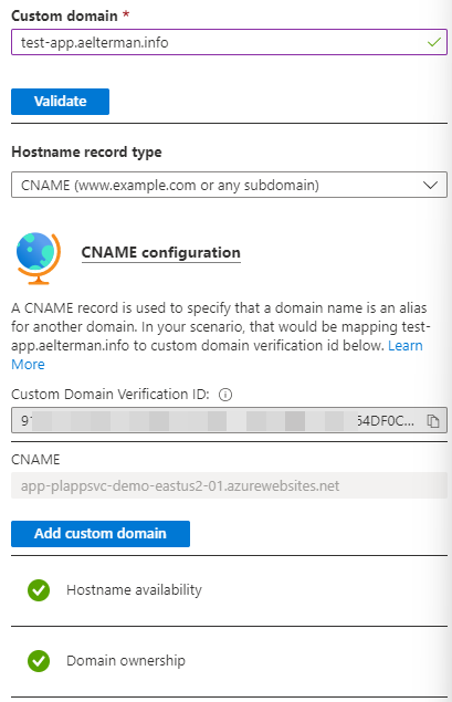 - Click Validate again. If the app service can successfully query for the existence of the two DNS entries, you can click the Add custom domain button. Your domain will then immediately be available.