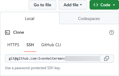 Replace GitHubUsername with your username (or the name of the organization if the repo is hosted in an organizational account) and RepositoryName with the name of the repo to be cloned. You can also find the entire string in GitHub, if you click the green Code button on the repo’s home page and then click the SSH tab.